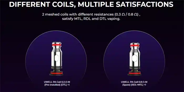 This coil kit has had new coils designed specifically for it. The coils for this kit are called Uwell PA Coil and currently come in 2 different variation options as illustrated below.