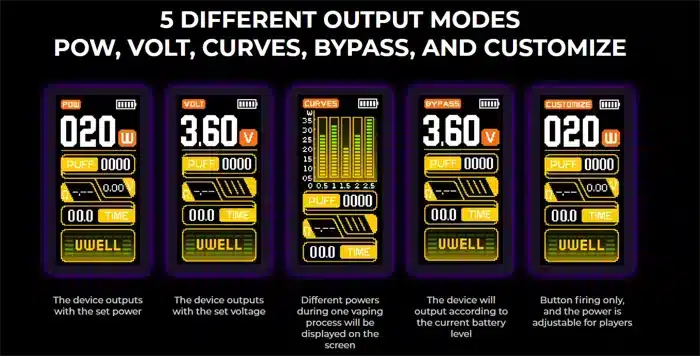 In addition to these features it is characterised by 5 different output modes: POW, VOLT, CURVES, BYPASS, and CUSTOMIZE. The CROWN D aims to enrich your vaping experiences while meeting the basic function needs. With the use of CURVES and BYPASS mode it allows you to further customise the device.